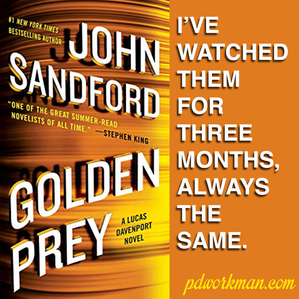 This week I am just finishing up Golden Prey, by John Sandford. This is an engaging thriller with more twists and turns than a bag of Twizzlers. The criminals are smart, and so are the federal marshal and agents on their tails. It is a great game of cat and mouse, and while the feds are bound to win in the end, I’m not quite sure how.