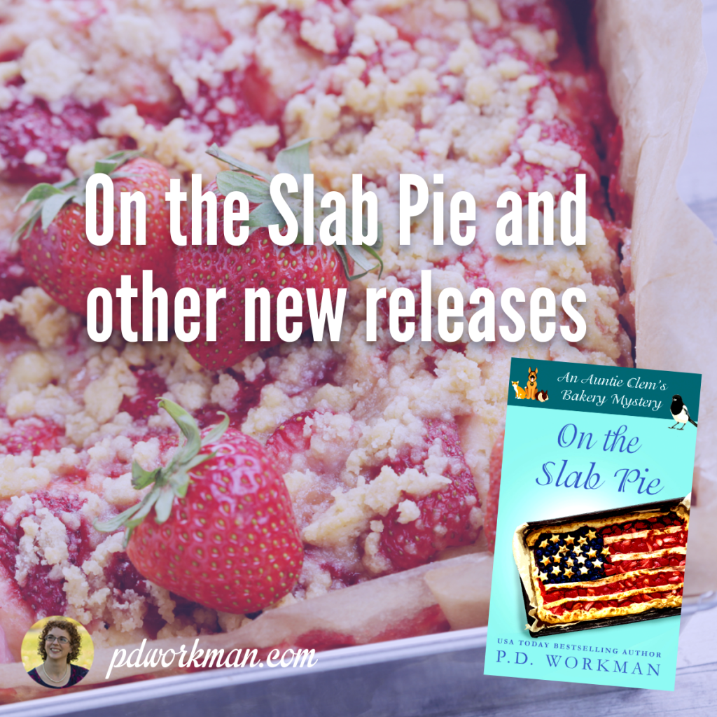 The time has come! Release day for On the Slab Pie, book #18 in the Auntie Clem’s Bakery series. Are you ready for a super twisty mystery? This one should satisfy your craving for a sweet treat! Erin and Vic are working for a slab pie for Statehood Day, but there are a few distractions…