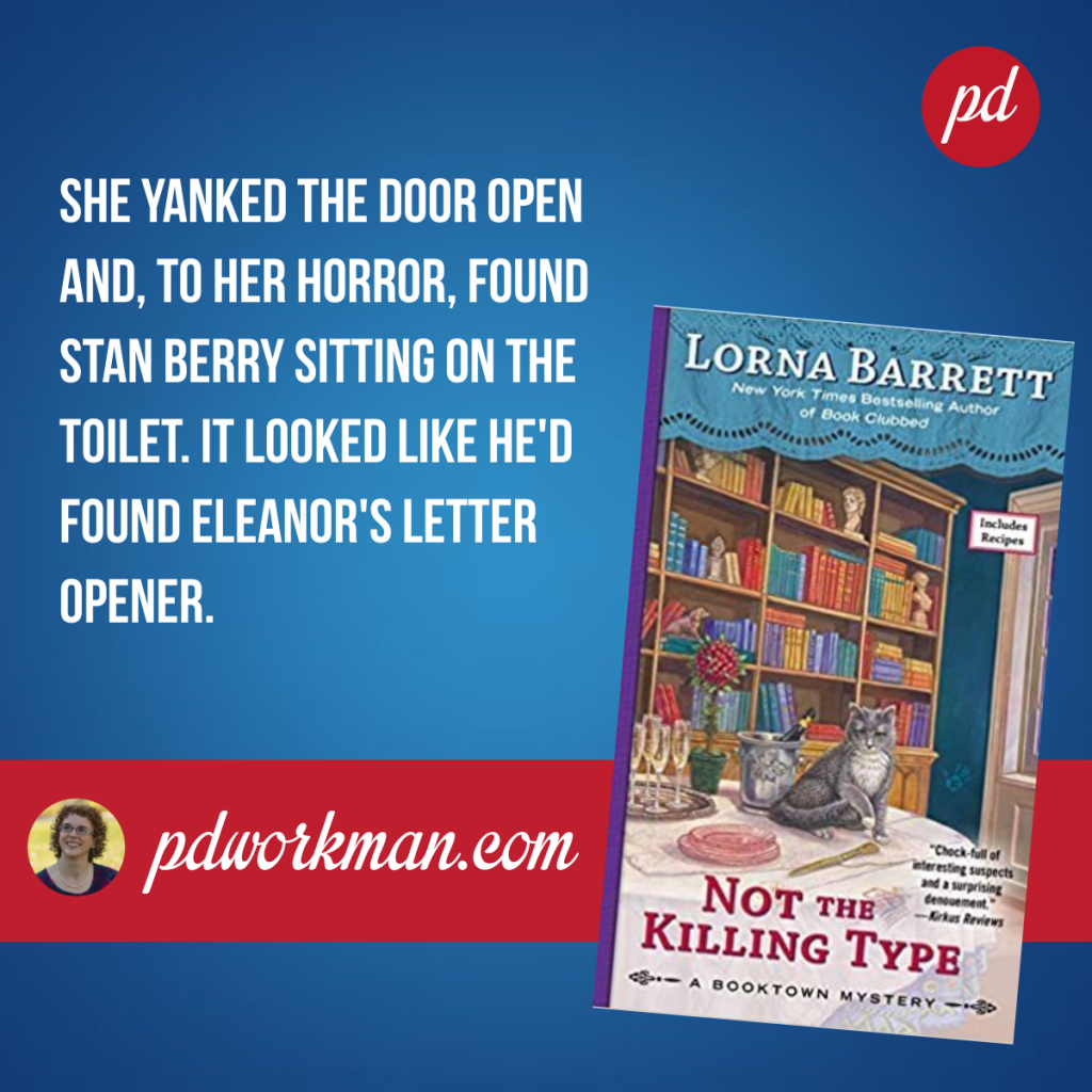 I have read several of Lorna Barrett’s Booktown cozy mystery series in the past, so was happy to return to the fictional village full of bookstores (what kind of a dream town would that be?) with Not the Killing Type, book #7 in the series. So nice to get back to Tricia, her employees Mr. Everett and Pixie, and of course her cat, Miss Marple in the Haven’t Got a Clue mystery bookstore.