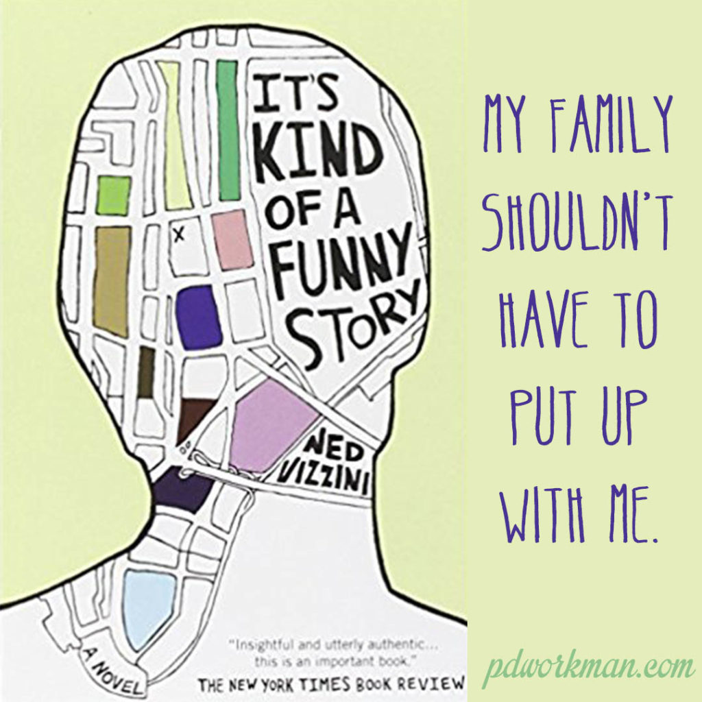 My current read is It’s Kind of a Funny Story by Ned Vizzini, a young adult book about depression and managing mental illness. It has been made into a much-acclaimed movie. In spite of the subject matter, it’s a light-hearted book with plenty of humour. While the thought processes and experiences of Craig, the main character with depression are quite different than mine, Ned Vizzini wrote from his own experience and tragically succumbed to his own depression at age 32.