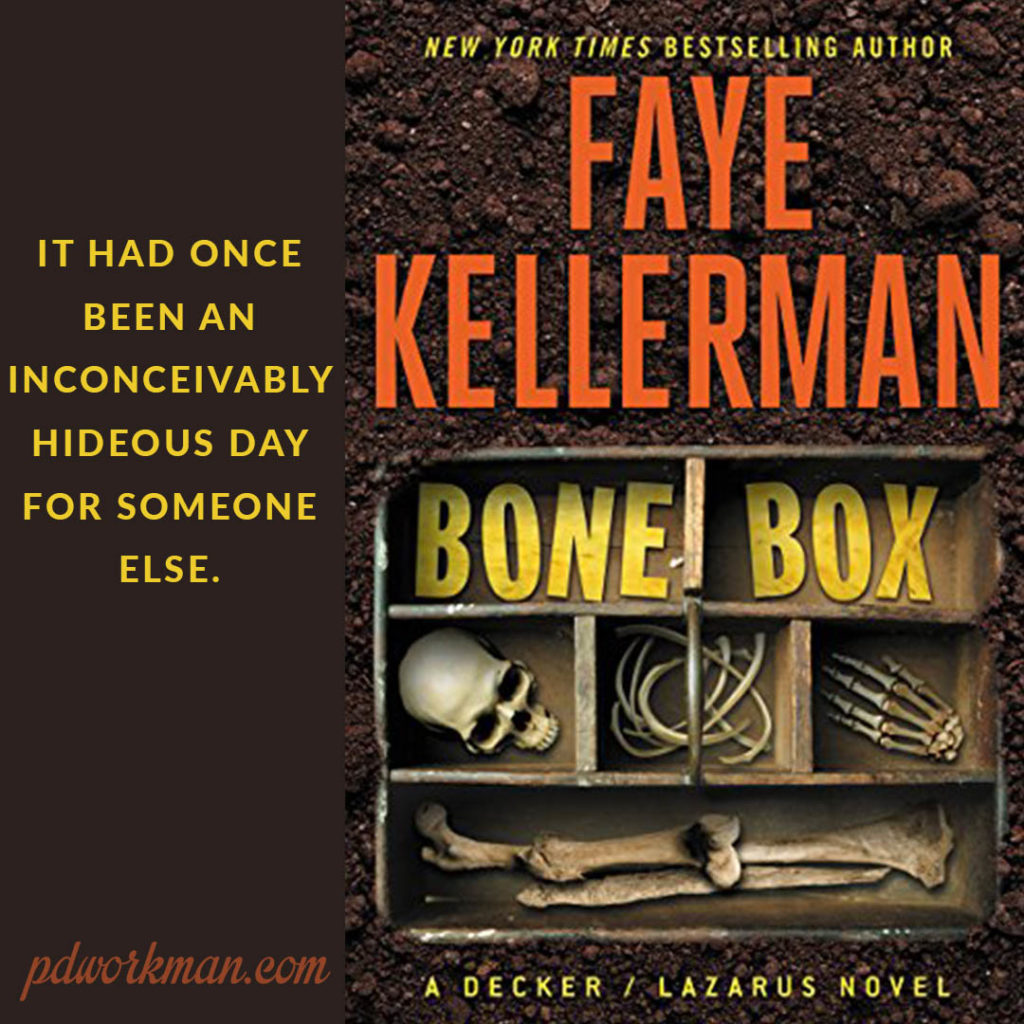 I am currently reading a book in the Decker/Lazarus Novels series by Faye Kellerman. Bone Box is book 25 in the series, just release in March this year. I am about a quarter of the way through, and so far am enjoying the twists and turns of the cold case investigation.