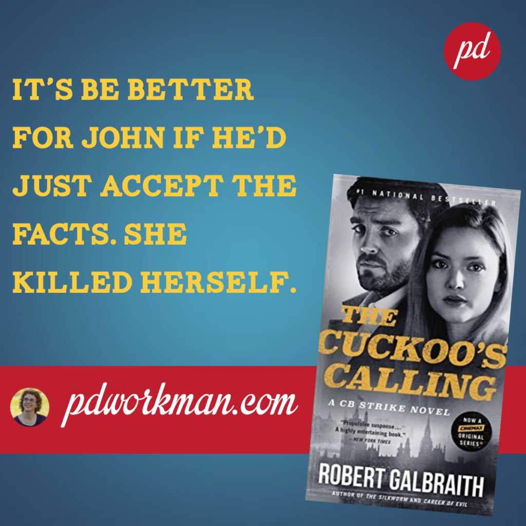 I am just finishing up with The Cuckoo’s Calling, first book in the Cormoran Strike series. I didn’t realize until I just looked over the series page now that the author is Robert Galbraith—I recognized the name but didn’t remember that’s J.K. Rowling’s pen name. I have also read book four in this series, but don’t remember very much about it.