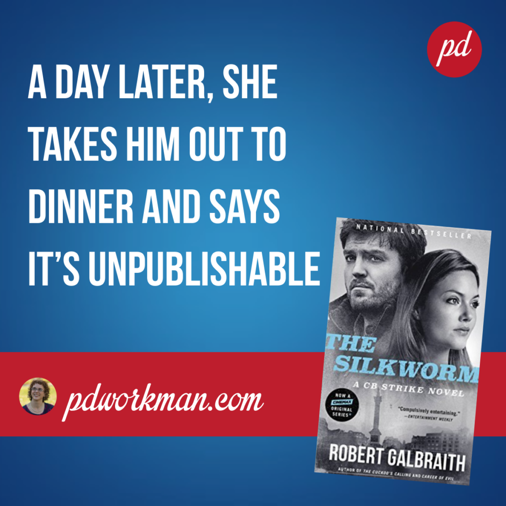 This week I am into Robert Galbraith’s The Silkworm, second book in the Cormoran Strike series. (Yes, that Robert Galbraith, one of the pen names of J.K. Rowling.) Private Investigator Cormoran Strike is looking for a missing writer, who was trying to get his tell-all book published. Lots of people are not happy to be included in the book, so you can bet there will be a lot of suspects in his disappearance and (spoiler) death. Sorry, I haven’t gotten to that part yet, the Amazon blurb gives it away.
