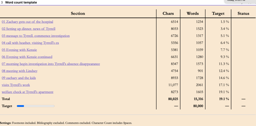 I have also added a link at the bottom of the template to an Excel spreadsheet where I paste my daily total so that I can track my targets/completed words.